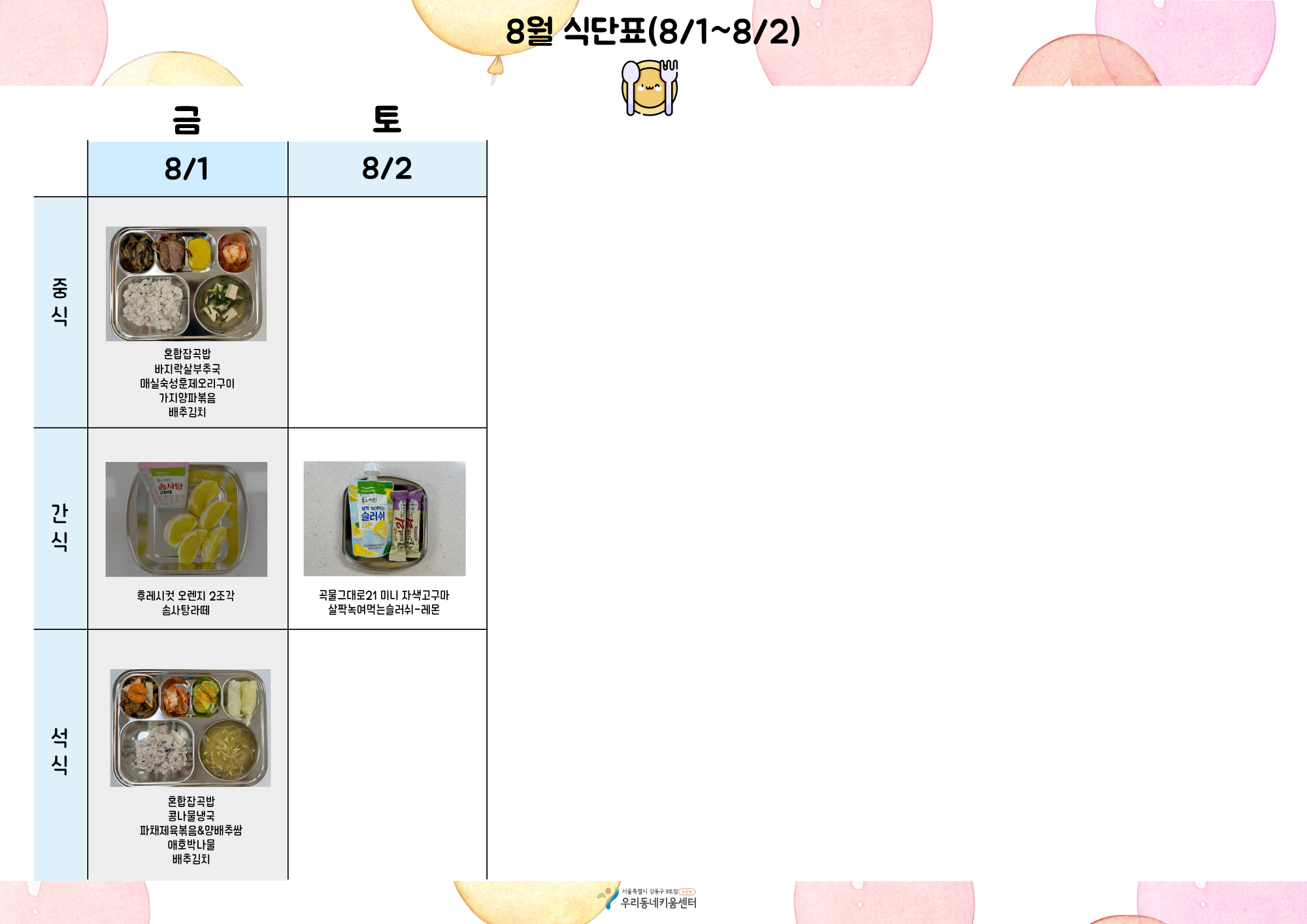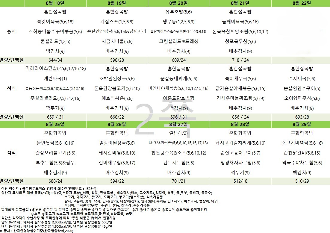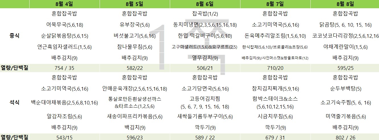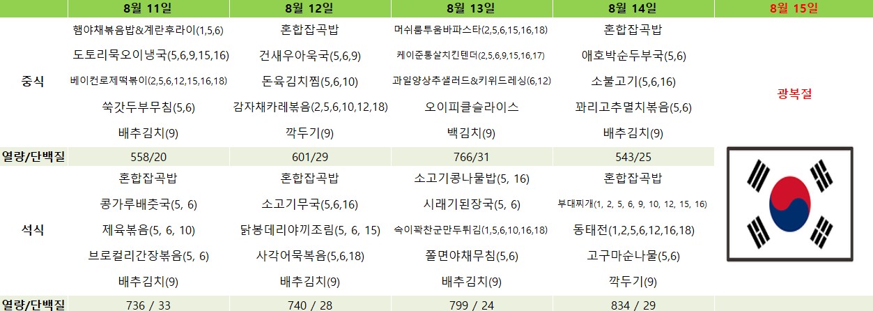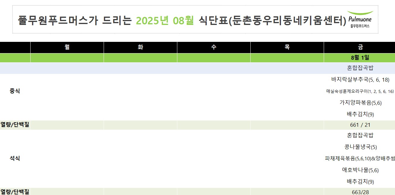 2025년 8월 급간식 식단표